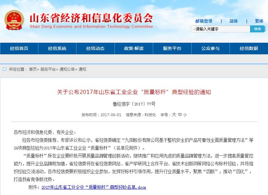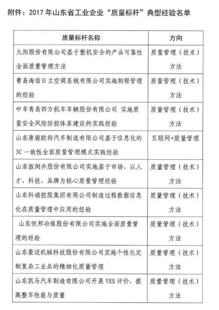 日前,2017年山東省工業(yè)企業(yè)“質(zhì)量標(biāo)桿”名單公布,國(guó)井扳倒井、九陽(yáng)、海信、中車(chē)青島四方、威高、中通客車(chē)、渤;钊、魏橋紡織等24家企業(yè)成為山東省工業(yè)企業(yè)質(zhì)量標(biāo)桿。
